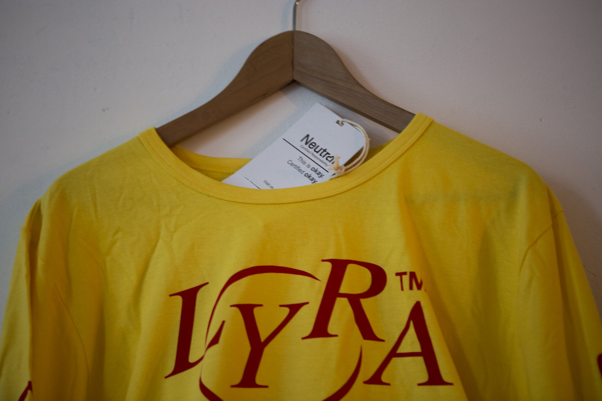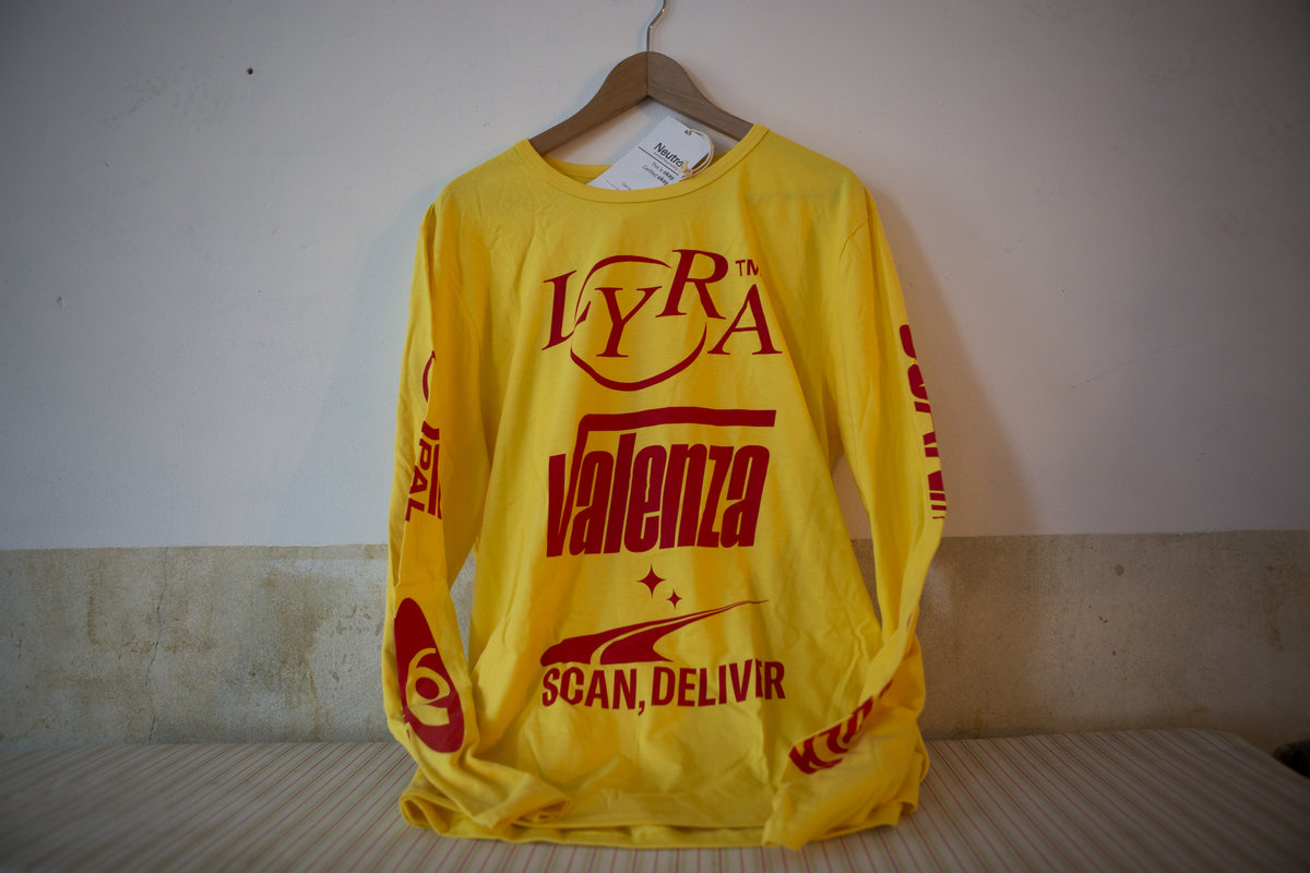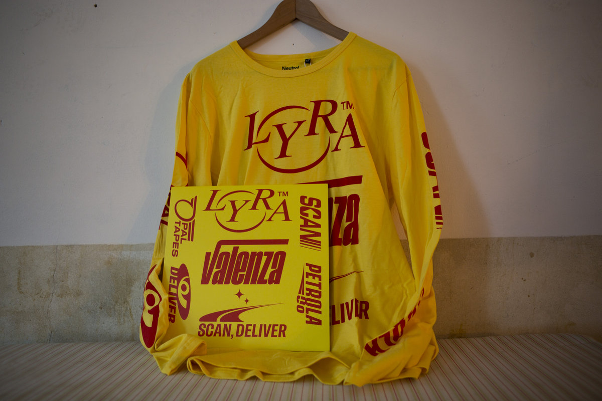 Limited Bundle with soft, comfortable and eco-friendly yellow long sleeve with red print in sizes S - XXL, and 12" vinyl edition of Lyra Valenza - "Scan, Deliver" EP. Designed by Laurits Hanak.