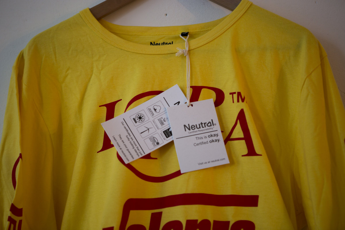 Ltd. edition repress October 2019. Red print on soft comfortable and eco-friendly yellow long sleeve shirt. Designed by Laurits Hanak. Sizes S - XXL